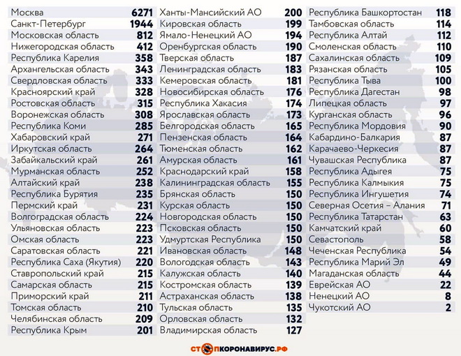Среди субъектов Российской Федерации, лидирующих по числу заболевших за сутки: Санкт-Петербург (1944 случая), Московская область (820), Нижегородская область (412), Республика Карелия (358), Архангельская область (343), Свердловская область (333), Красноярский край (328), Ростовская область (315), Воронежская область (308).