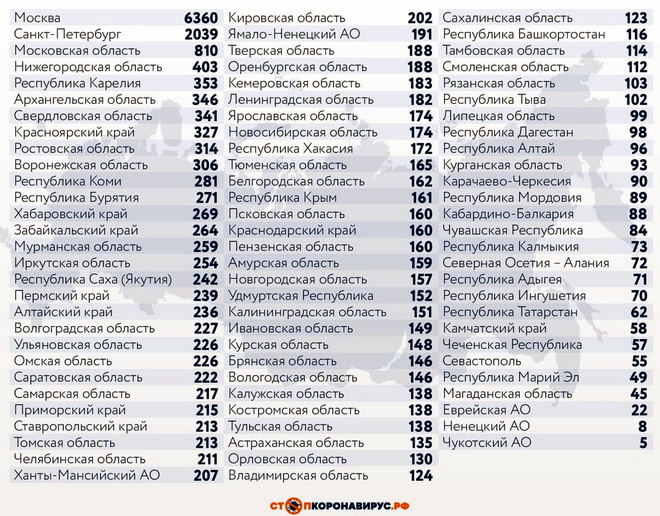 Среди субъектов Российской Федерации, лидирующих по числу заболевших за сутки: Санкт-Петербург (2039 случаев), Московская область (810), Нижегородская область (403), Республика Карелия (353), Архангельская область (346), Свердловская область (341), Красноярский край (327), Ростовская область (314), Воронежская область (306).