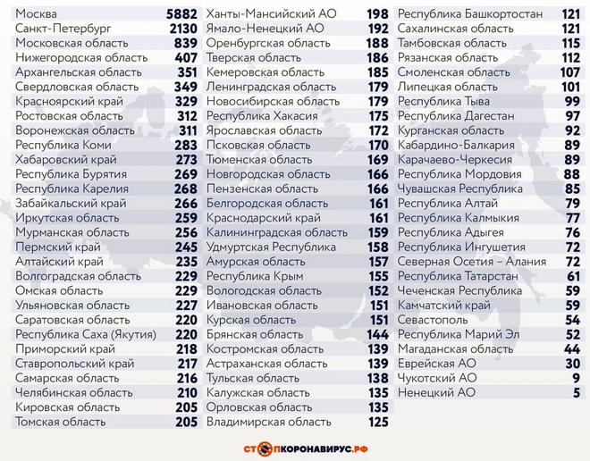 Среди субъектов Российской Федерации, лидирующих по числу заболевших за сутки: Санкт-Петербург (2130 случаев), Московская область (839), Нижегородская область (407), Архангельская область (351), Свердловская область (349), Красноярский край (329), Ростовская область (313), Воронежская область (311).