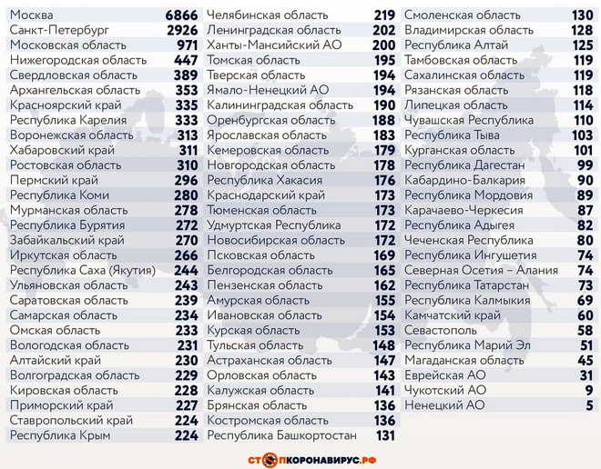 Среди субъектов Российской Федерации, лидирующих по числу заболевших за сутки: Санкт-Петербург (2926 случаев), Московская область (971), Нижегородская область (447), Свердловская область (389), Архангельская область (353), Красноярский край (335), Республика Карелия (333), Воронежская область (317), Хабаровский край (311), Ростовская область (310).