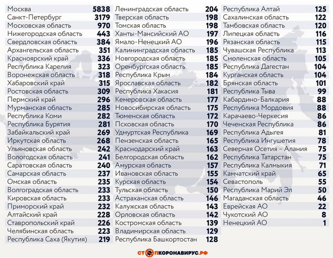 Среди субъектов Российской Федерации, лидирующих по числу заболевших за сутки: Санкт-Петербург (3179 случаев), Московская область (970), Нижегородская область (443), Свердловская область (384), Архангельская область (351), Красноярский край (336), Республика Карелия (323), Воронежская область (318), Хабаровский край (315), Ростовская область (309).