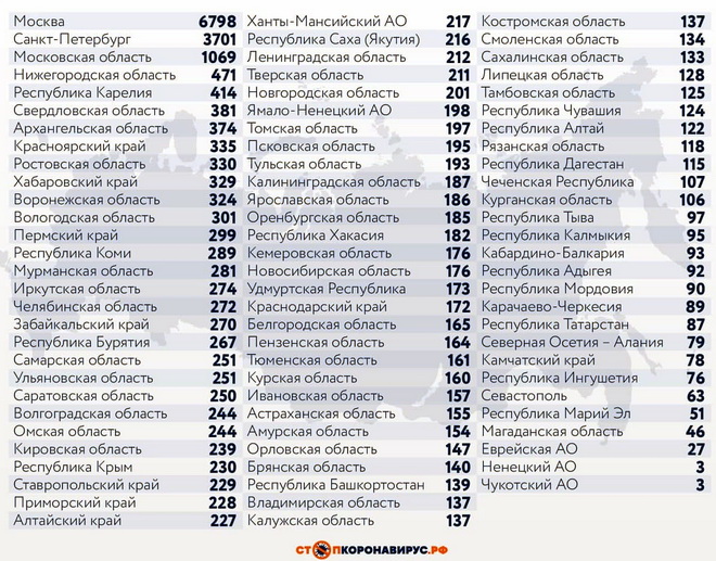 Уже в трёх субъектах Федерации число заразившихся за день – четырёхзначное. Среди регионов Российской Федерации, лидирующих по числу заболевших за сутки: Санкт-Петербург (3701 случай), Московская область (1069), Нижегородская область (471), Республика Карелия (414), Свердловская область (381), Архангельская область (374), Красноярский край (335), Ростовская область (330), Хабаровский край (329), Воронежская область (324), Вологодская область (301).