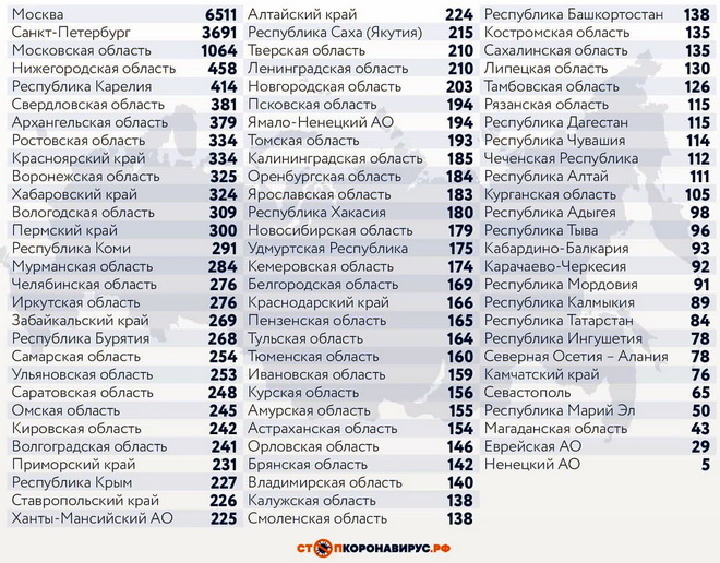 Среди субъектов Федерации, лидирующих по числу заболевших за сутки: Санкт-Петербург (3691 случай), Московская область (1064), Нижегородская область (458), Республика Карелия (414), Свердловская область (381), Архангельская область (379), Красноярский край (334), Ростовская область (334), Воронежская область (325), Хабаровский край (324), Вологодская область (309), Пермский край (300).