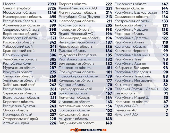 Среди субъектов Федерации, лидирующих по числу заболевших за сутки: Санкт-Петербург (3726 случая), Московская область (1246), Нижегородская область (495), Республика Карелия (473), Архангельская область (399), Свердловская область (398), Воронежская область (373), Вологодская область (371), Ростовская область (342), Хабаровский край (341), Красноярский край (331), Пермский край (306), Челябинская область (305).