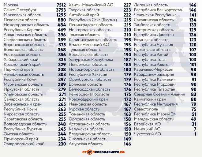 Среди субъектов Федерации, лидирующих по числу заболевших за сутки: Санкт-Петербург (3753 случая), Московская область (1295), Псковская область (880), Нижегородская область (484), Республика Карелия (469), Архангельская область (396), Свердловская область (389), Воронежская область (375), Вологодская область (368), Ростовская область (356), Хабаровский край (335), Красноярский край (329), Пермский край (308), Челябинская область (303).