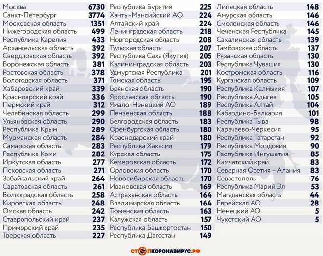 Среди субъектов Федерации, лидирующих по числу заболевших за сутки: Санкт-Петербург (3774 случая), Московская область (1351), Нижегородская область (499), Республика Карелия (433), Архангельская область (392), Свердловская область (392), Воронежская область (381), Ростовская область (378), Вологодская область (371), Хабаровский край (339), Красноярский край (336), Псковская область (335), Пермский край (312), Челябинская область (299).