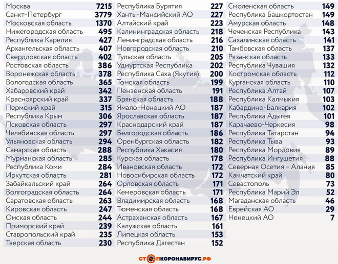 Среди субъектов Федерации, лидирующих по числу заболевших за сутки: Санкт-Петербург (3779 случаев), Московская область (1370), Нижегородская область (495), Республика Карелия (427), Архангельская область (407), Свердловская область (402), Ростовская область (386), Воронежская область (378), Вологодская область (365), Хабаровский край (342), Красноярский край (337), Пермский край (315), Республика Крым (306), Псковская область (297), Челябинская область (297).