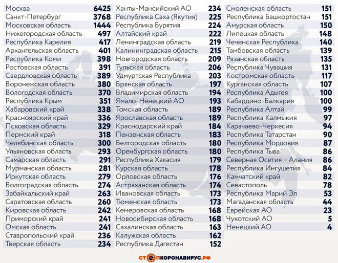 Среди субъектов Федерации, лидирующих по числу заболевших за сутки: Санкт-Петербург (3768 случаев), Московская область (1444), Нижегородская область (497), Республика Карелия (417), Архангельская область (401), Республика Коми (398), Ростовская область (391), Свердловская область (389, Воронежская область (380), Вологодская область (370), Республика Крым (351), Хабаровский край (338), Красноярский край (336), Псковская область (329), Пермский край (318), Челябинская область (300).