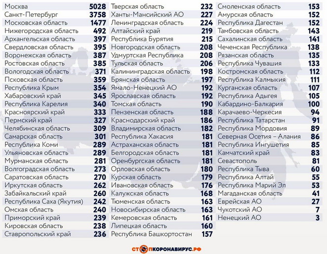 Среди субъектов Федерации, лидирующих по числу заболевших за сутки: Санкт-Петербург (3758 случаев), Московская область (1477), Нижегородская область (492), Архангельская область (397), Свердловская область (395), Воронежская область (387), Ростовская область (385), Вологодская область (371), Псковская область (359), Республика Крым (354), Хабаровский край (345), Республика Карелия (340), Красноярский край (333), Пермский край (327), Челябинская область (309).