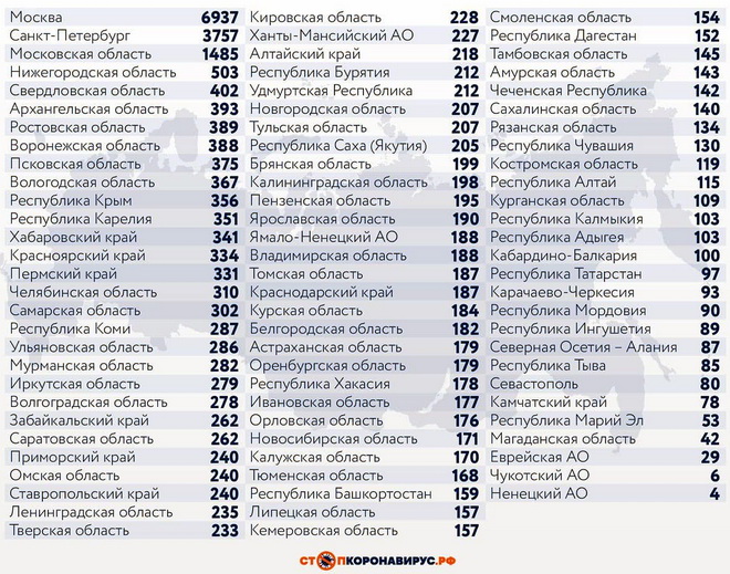 Среди субъектов Федерации, лидирующих по числу заболевших за сутки: Санкт-Петербург (3757 случаев), Московская область (1485), Нижегородская область (503), Свердловская область (402), Архангельская область (393), Ростовская область (389), Воронежская область (388), Псковская область (375), Вологодская область (367), Республика Крым (356), Республика Карелия (351), Хабаровский край (341), Красноярский край (334), Пермский край (331), Челябинская область (310), Самарская область (302).