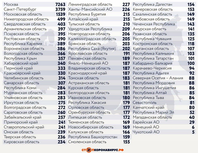 Среди субъектов Федерации, лидирующих по числу заболевших за сутки: Санкт-Петербург (3759 случаев), Московская область (1539), Нижегородская область (499), Свердловская область (403), Архангельская область (397), Псковская область (395), Ростовская область (390), Республика Карелия (389), Воронежская область (386).