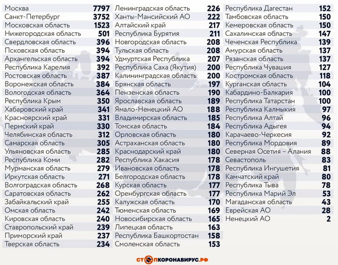 Среди субъектов Федерации, лидирующих по числу заболевших за сутки: Санкт-Петербург (3752 случая), Московская область (1523), Нижегородская область (501), Свердловская область (396), Псковская область (394), Архангельская область (394), Республика Карелия (392), Ростовская область (387), Воронежская область (384).