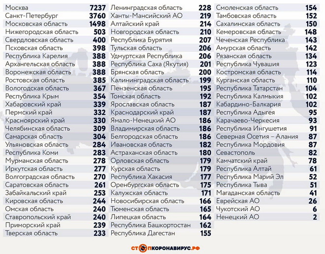 Среди субъектов Федерации, лидирующих по числу заболевших за сутки: Санкт-Петербург (3760 случаев), Московская область (1498), Нижегородская область (503), Свердловская область (400), Псковская область (398), Воронежская область (388),