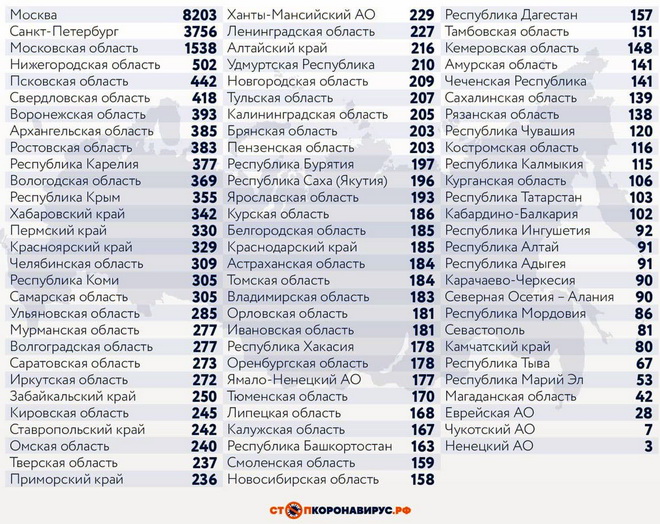 Среди субъектов Федерации, лидирующих по числу заболевших за сутки: Санкт-Петербург (3756 случаев), Московская область (1538), Нижегородская область (502), Псковская область (442), Свердловская область (418), Воронежская область (393), Архангельская область (385), Ростовская область (383).