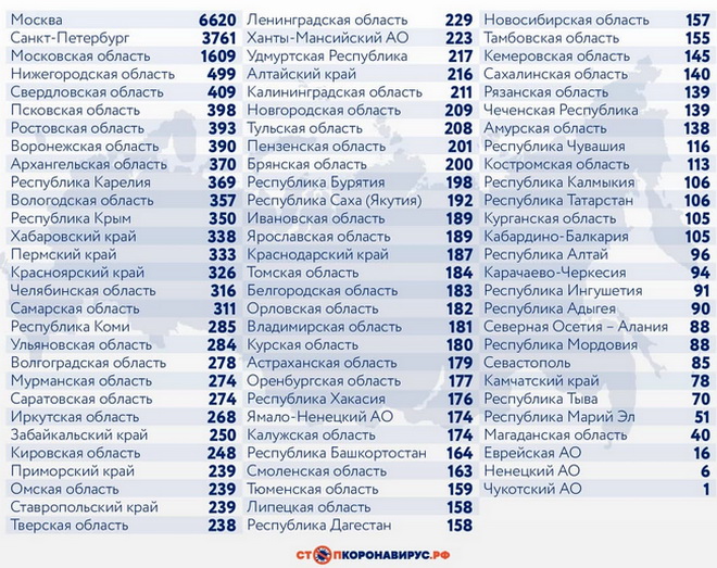 Среди субъектов Федерации, лидирующих по числу заболевших за сутки: Санкт-Петербург (3761 случай), Московская область (1609), Нижегородская область (499), Свердловская область (409), Псковская область (398), Ростовская область (393), Воронежская область (390), Архангельская область (370), Республика Карелия (369).
