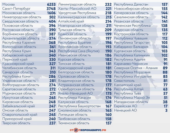 Санкт-Петербург (3748 случаев), Московская область (1606), Нижегородская область (502), Свердловская область (404), Псковская область (396), Ростовская область (390), Воронежская область (387), Архангельская область (374), Республика Карелия (368).