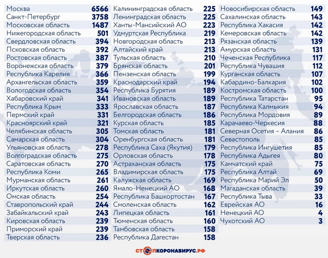 Санкт-Петербург (3758 случаев), Московская область (1487), Нижегородская область (501), Свердловская область (394), Псковская область (392), Ростовская область (387), Воронежская область (379), Республика Карелия (366), Архангельская область (359), Вологодская область (354).