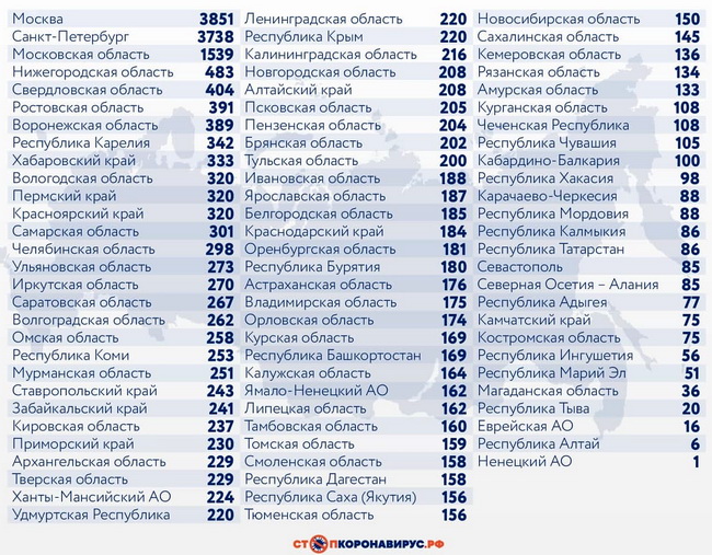 Санкт-Петербург (3738 случаев), Московская область (1539), Нижегородская область (483), Свердловская область (404), Ростовская область (391), Воронежская область (389), Республика Карелия (342), Хабаровский край (333).