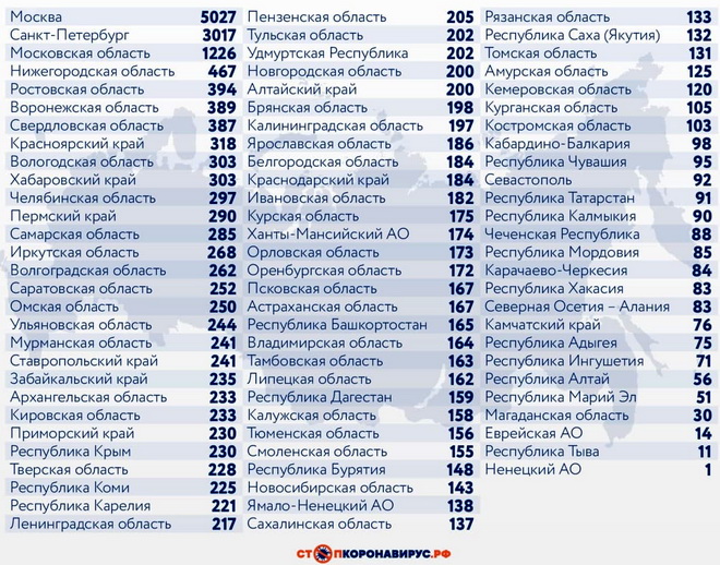 Санкт-Петербург (3017 случаев), Московская область (1226), Нижегородская область (467), Ростовская область (394), Воронежская область (389), Свердловская область (387), Красноярский край (318), Вологодская область (303), Хабаровский край (303).