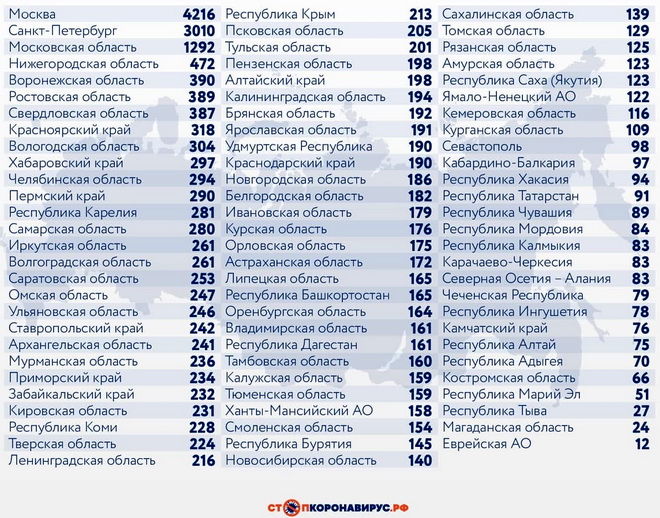 Санкт-Петербург (3010 случаев), Московская область (1292), Нижегородская область (472), Воронежская область (390), Ростовская область (389), Свердловская область (387), Красноярский край (318), Вологодская область (304), Хабаровский край (297).