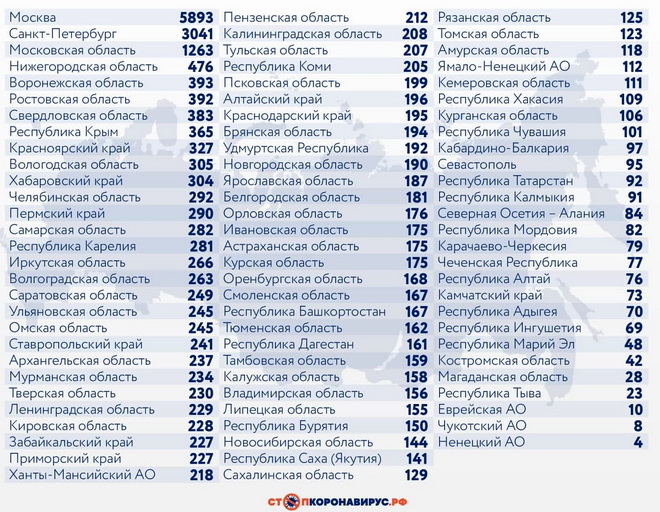 Санкт-Петербург (3041 случай), Московская область (1263), Нижегородская область (476), Воронежская область (393), Ростовская область (392), Свердловская область (383), Республика Крым (365), Красноярский край (327), Вологодская область (305), Хабаровский край (304).