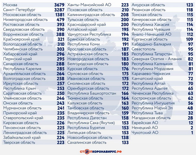 Санкт-Петербург (3287 случаев), Московская область (1381), Нижегородская область (479), Ростовская область (393), Свердловская область (390), Воронежская область (388), Красноярский край (321), Вологодская область (310), Челябинская область (303), Хабаровский край (296).