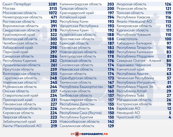Санкт-Петербург (3115 случаев), Московская область (1072), Нижегородская область (471), Ростовская область (392), Воронежская область (391), Свердловская область (378), Красноярский край (322), Вологодская область (305), Челябинская область (302), Хабаровский край (298).