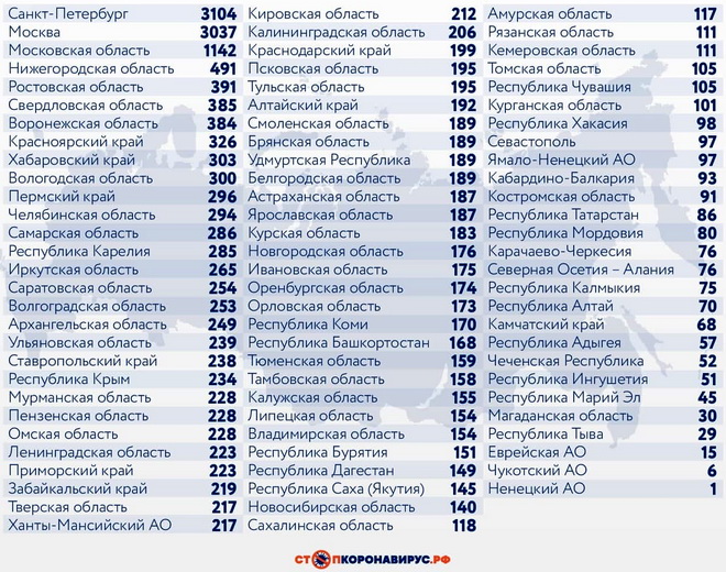 Санкт-Петербург (3104 случая), Московская область (1142), Нижегородская область (491), Ростовская область (391), Свердловская область (385), Воронежская область (384), Красноярский край (326), Хабаровский край (303), Вологодская область (300).