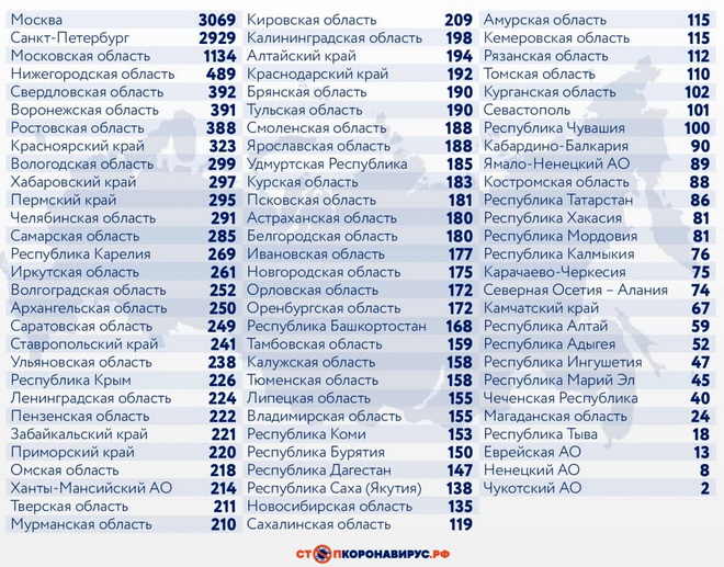 Санкт-Петербург (2929 случаев), Московская область (1134), Нижегородская область (489), Свердловская область (392), Воронежская область (391), Ростовская область (388), Красноярский край (323), Вологодская область (299), Хабаровский край (297).