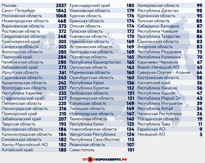 Санкт-Петербург (1842 случая), Московская область (1068), Нижегородская область (468), Воронежская область (373), Ростовская область (372), Свердловская область (348), Красноярский край (305), Самарская область (305).