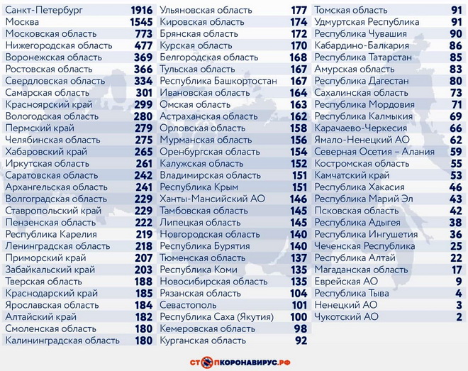 Санкт-Петербург (1916 случаев), Московская область (773), Нижегородская область (477), Воронежская область (369), Ростовская область (366), Свердловская область (334), Красноярский край (299).