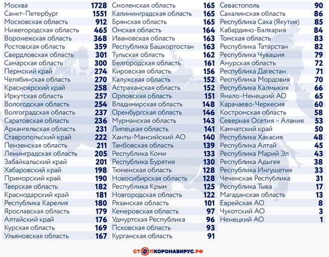 Санкт-Петербург (1551 случай), Московская область (912), Нижегородская область (465), Воронежская область (368), Ростовская область (359), Свердловская область (301), Самарская область (300).
