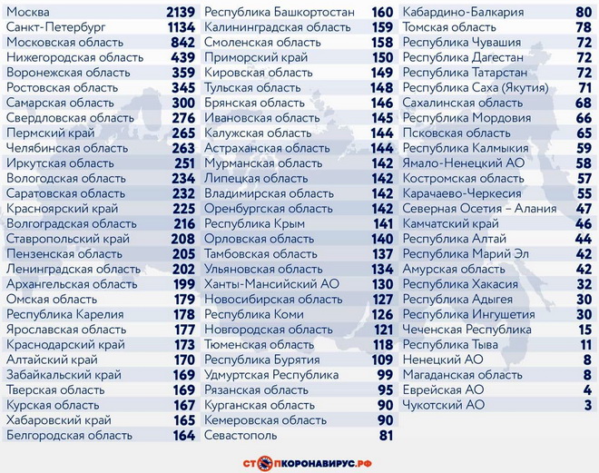 Санкт-Петербург (1134 случаев), Московская область (842), Нижегородская область (439), Воронежская область (359), Ростовская область (345), Самарская область (300), Свердловская область (276).
