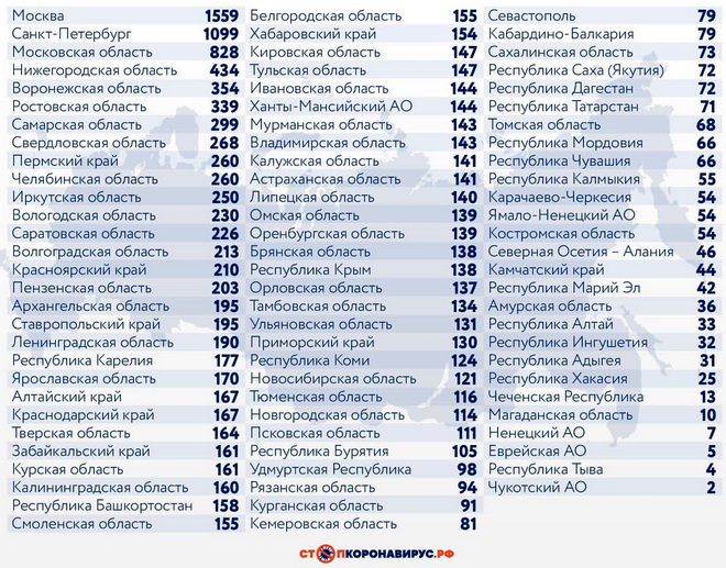 Санкт-Петербург (1099 случаев), Московская область (828), Нижегородская область (434), Воронежская область (354), Ростовская область (339), Самарская область (299), Свердловская область (268).