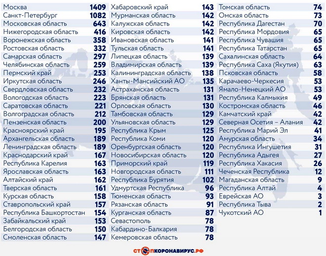 Санкт-Петербург (1082 случая), Московская область (643), Нижегородская область (416), Воронежская область (358), Ростовская область (332), Самарская область (297), Челябинская область (259).