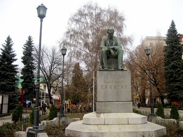 В платоновском смысле что - «душа человека - неприличное животное». Но что поделать - не смогли остановить... не успели, не сохранили, не хватило сил... Вот, в центре города - купеческий сынок, известный демократ, руководитель интеллектуального кружка города - классик, поэт Никитин... невесёлый очень... Не радуют его что-то демократические плакатики...Отличный памятник, выразительный очень. Отчаяние и скорбь. Уж никак он не мог даже своим поэтическим воображением представить - такое... вот и загрустил... о судьбе народа».