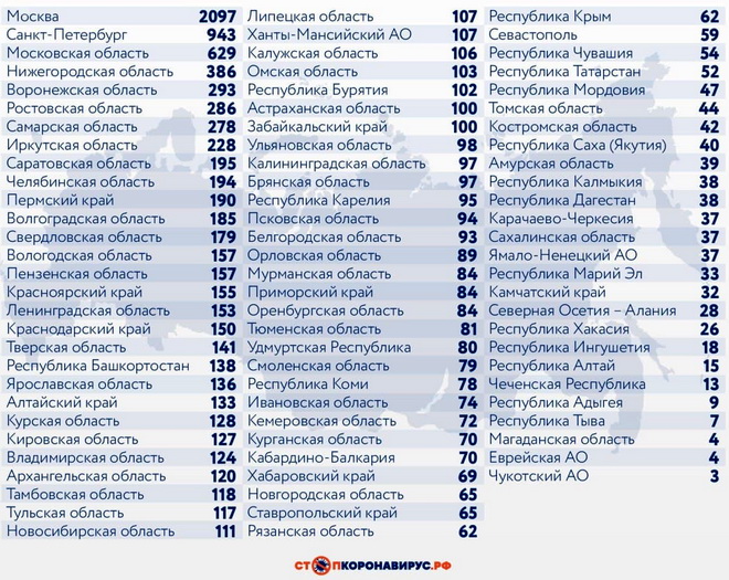 Санкт-Петербург (943 случая), Московская область (629), Нижегородская область (386), Воронежская область (293), Ростовская область (286), Самарская область (278).