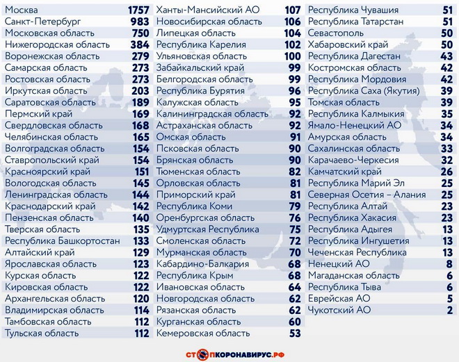 Санкт-Петербург (983 случая), Московская область (750), Нижегородская область (384), Воронежская область (279), Ростовская область (273), Самарская область (273).