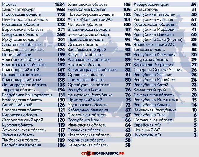 Санкт-Петербург (968 случаев), Московская область (773), Нижегородская область (383), Ростовская область (272), Воронежская область (271), Самарская область (268).