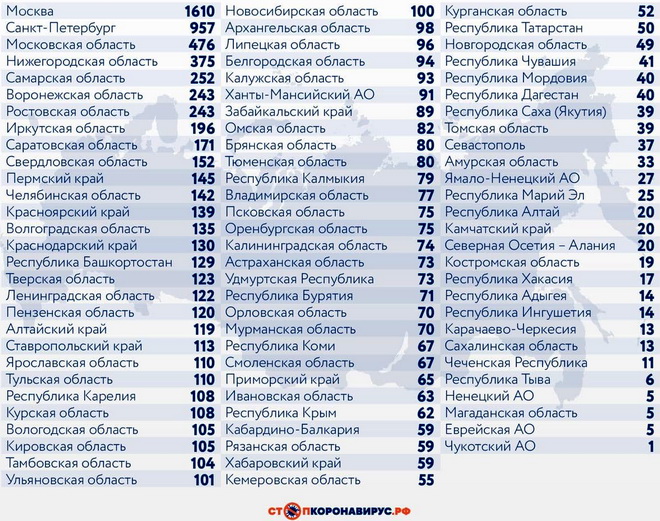 По числу заболевших за сутки среди субъектов Федерации лидируют: Санкт-Петербург (957 случаев), Московская область (476), Нижегородская область (375), Самарская область (252), Ростовская область (243), Воронежская область (243).