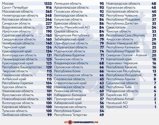 Субъекты Федерации – лидеры по числу заболевших за последние сутки: Санкт-Петербург (916 случаев), Московская область (565), Нижегородская область (348), Ростовская область (246), Самарская область (227), Воронежская область (219).