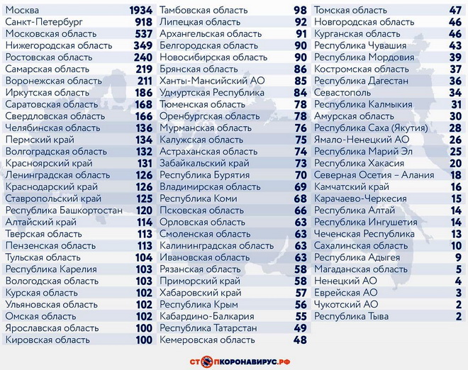 Из субъектов Федерации по числу заболевших за последние 24 часа выделяются Санкт-Петербург (918 случаев), Московская область (537), Нижегородская область (349), Ростовская область (240), Самарская область (219), Воронежская область (211).