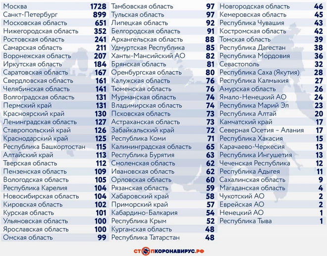 Среди субъектов Федерации по числу заболевших за последние сутки выделяются Санкт-Петербург (899 случаев), Московская область (651), Нижегородская область (352), Ростовская область (241), Самарская область (211), Воронежская область (207).