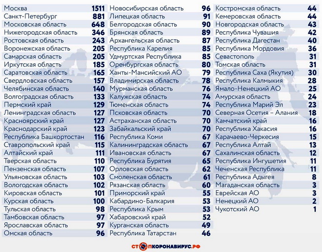 Из субъектов Федерации по числу заболевших за истекшие 24 часа выделяются Санкт-Петербург (881 случай), Московская область (648), Нижегородская область (346), Ростовская область (243), Самарская область (205), Воронежская область (205).
