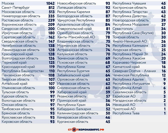Среди субъектов Федерации по числу заболевших за последние 24 часа лидируют Санкт-Петербург (812 случаев), Московская область (513), Нижегородская область (335), Ростовская область (239), Воронежская область (209), Самарская область (200).