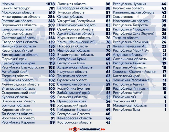 Из субъектов Федерации по количеству заболевших за сутки выделяются Санкт-Петербург (701 случай), Московская область (610), Нижегородская область (286), Ростовская область (243), Воронежская область (209), Самарская область (199).