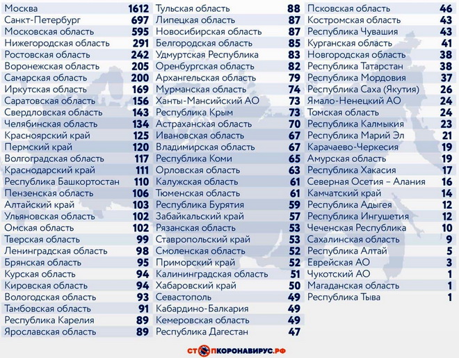 Среди субъектов Федерации по количеству заболевших за сутки лидируют Санкт-Петербург (697 случаев), Московская область (595), Нижегородская область (291), Ростовская область (242), Воронежская область (205), Самарская область (200).
