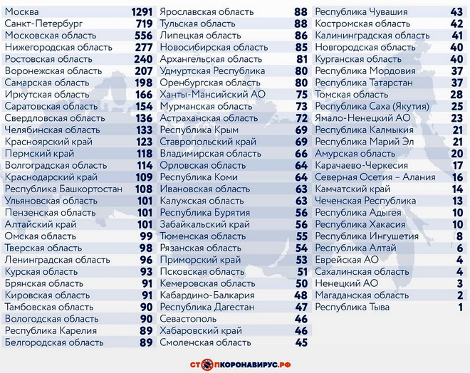 Из субъектов Федерации по количеству заболевших за сутки выделяются Санкт-Петербург (719 случаев), Московская область (556), Нижегородская область (277), Ростовская область (240), Воронежская область (207), Самарская область (198).