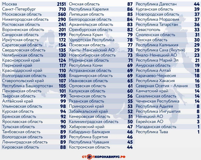 Из субъектов Федерации по количеству заболевших за сутки выделяются Санкт-Петербург (710 случаев), Московская область (560), Нижегородская область (290), Ростовская область (241), Воронежская область (201), Самарская область (199), Иркутская область (172).