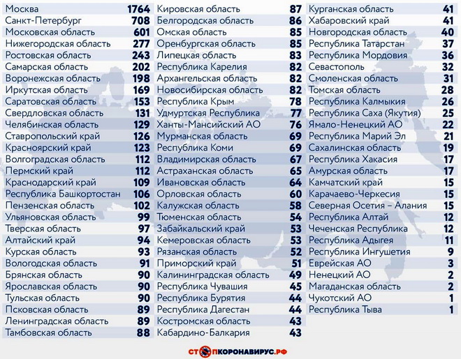 Среди субъектов Федерации по числу заболевших за 24 часа лидируют Санкт-Петербург (708 случаев), Московская область (601), Нижегородская область (277), Ростовская область (243), Самарская область (202), Воронежская область (198), Иркутская область (169).